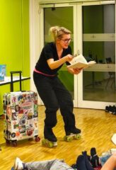 Kurz von 19 Uhr startete die Lesung und alle Anwesenden – ganz ohne Ausnahme – hörten von Anfang an gespannt zu. Und man war sich einig: diese Lesung war etwas Besonderes: Die Autorin blieb während der Lesung nicht ruhig sitzen, sondern war auf ihren Rollschuhen, die sie kurz vorher angezogen hatte, immer in Bewegung. Und sie las nicht nur, sie spielte. Ausdrucksstark, mit viel Leidenschaft zog sie alle in ihren Bann, alle waren von der lustigen, berührenden und emotionalen Geschichte gefesselt.