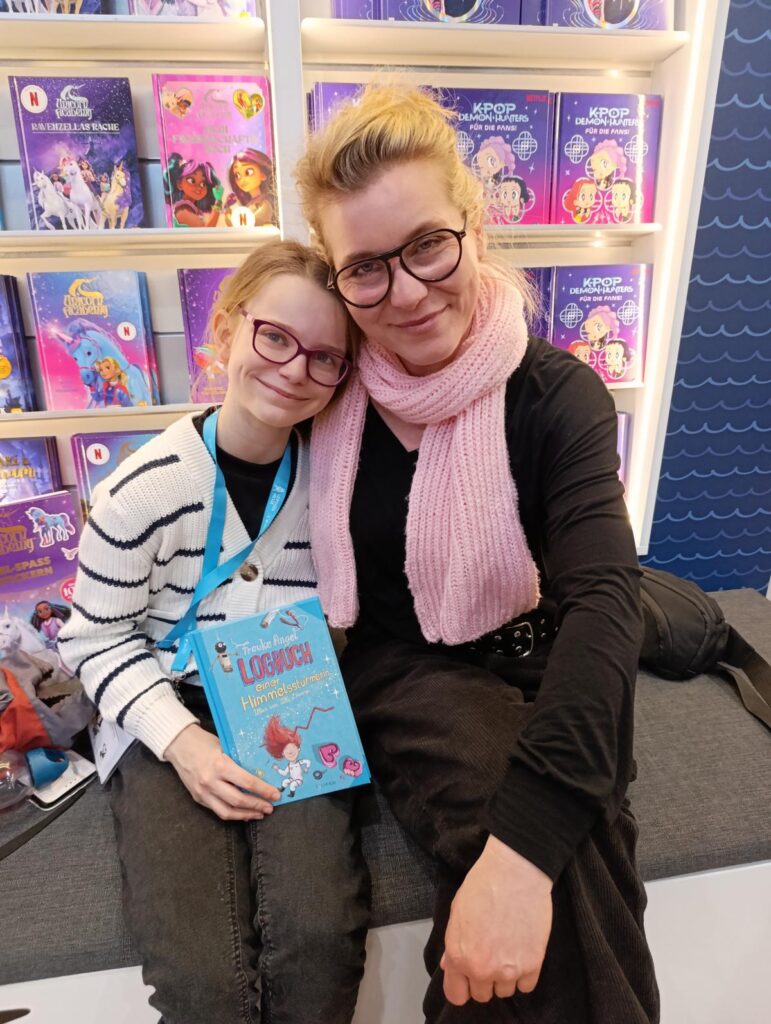 Es ist kurz vor 13 Uhr als wir auf der Leipziger Buchmesse den Stand von Penguin Jugendbücher ansteuerten, wo sich Florentine mit der Autorin Frauke Angel zu einem Interview verabredet hatte. Es war ein schöner Moment für meine Tochter, die mit einer warmen und herzlichen Umarmung von Frauke begrüßt wurde. Die beiden suchten sich einen Platz am Stand und ganz schnell begann das Gespräch zwischen den beiden und Florentine konnte ihre Fragen stellen.