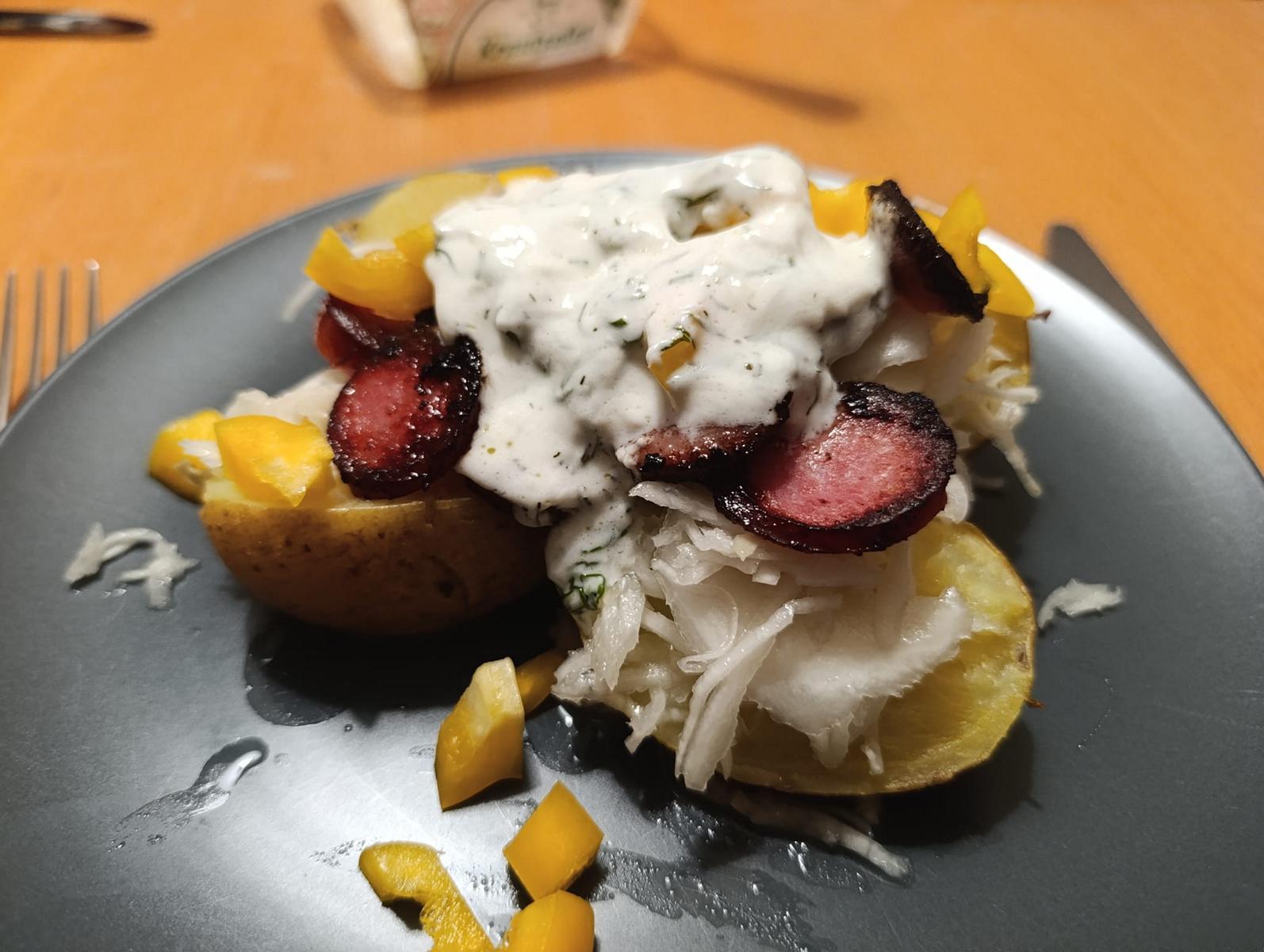 Bratöl in die Kartoffeln träufeln und untermischen. Mit Krautsalat, Paprika und Chorizo füllen und mit Joghurtsoße toppen.