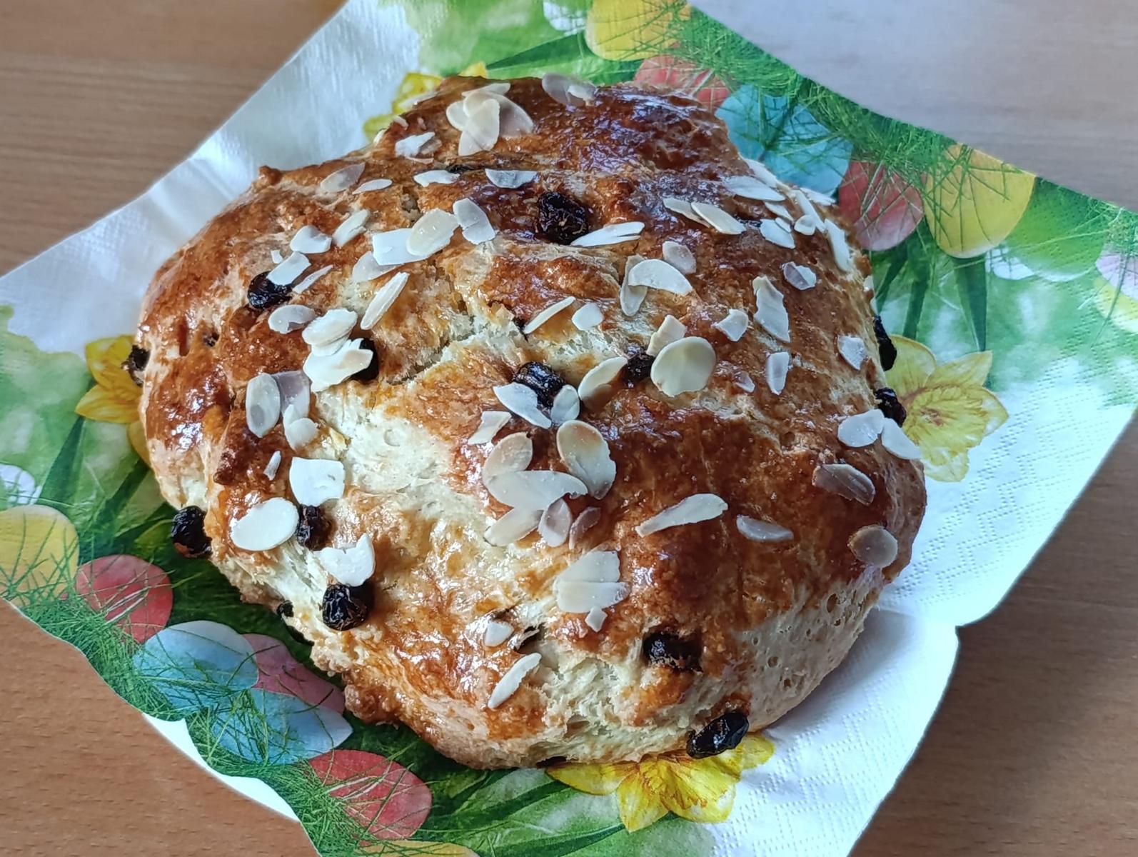 Schneide es kreuzförmig ein und bestreue es nach Belieben mit Mandeln oder Hagelzucker. Backe das Osterbrot im unteren Drittel deines Backofens ca. 50 Minuten bei 180°C Ober-/Unterhitze.