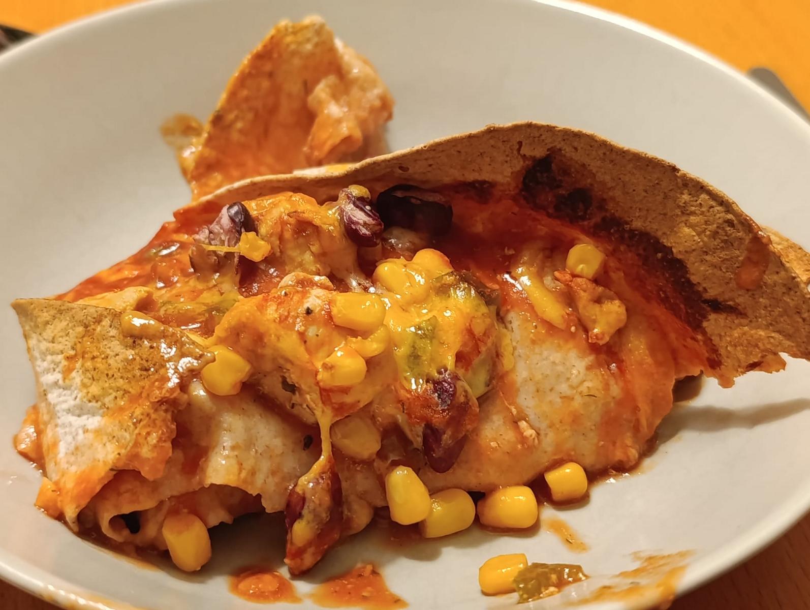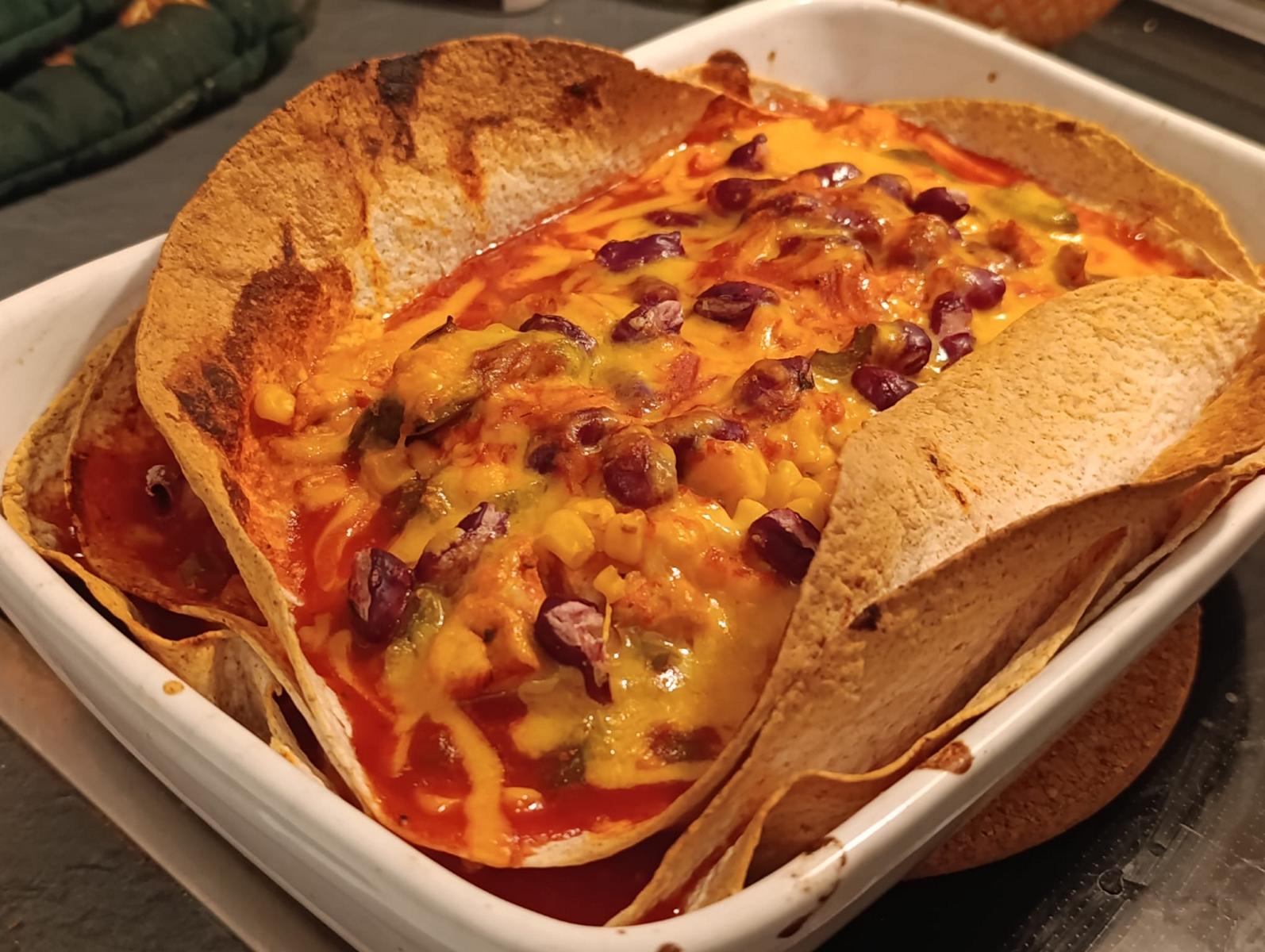 Die Bohnen und den Mais gut abtropfen lassen. Einen Tortilla-Wrap in eine passende Auflaufform (etwa 16 x 23 cm) legen. Schneide die Wraps bei Bedarf so zu, dass sie gut passen. Verteile die Hälfte der Hähnchen-Tomatensoße auf dem ersten Wrap. Den nächsten Wrap darauflegen, dann die Bohnen und den Mais daraufgeben und mit 50 g Käse bestreuen. Eine weitere Tortilla darauf schichten, die restliche Hähnchensoße darüber verteilen und den restlichen Käse darauf streuen.